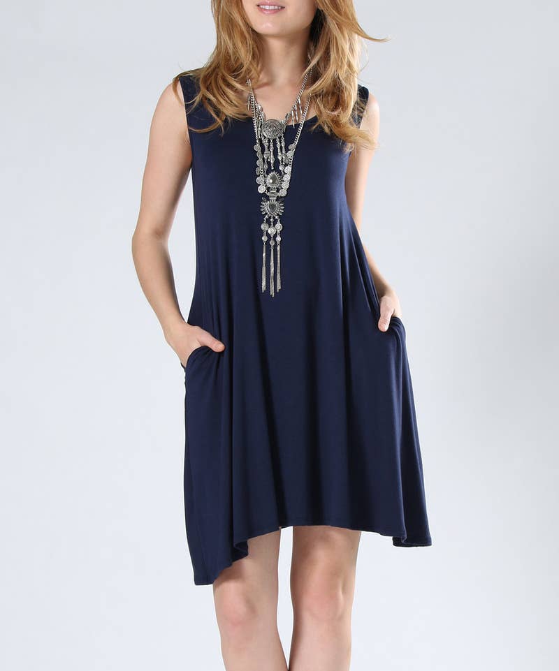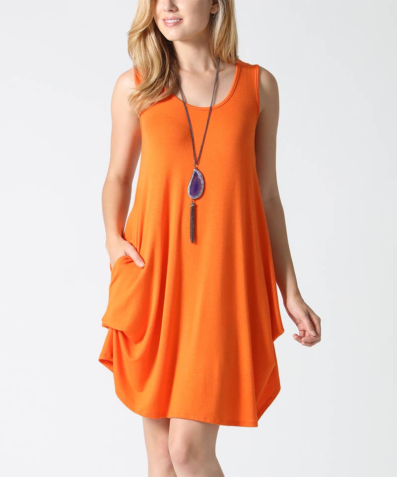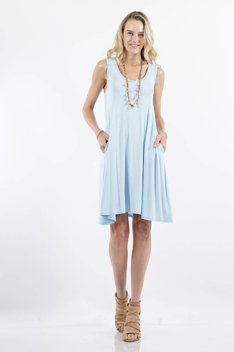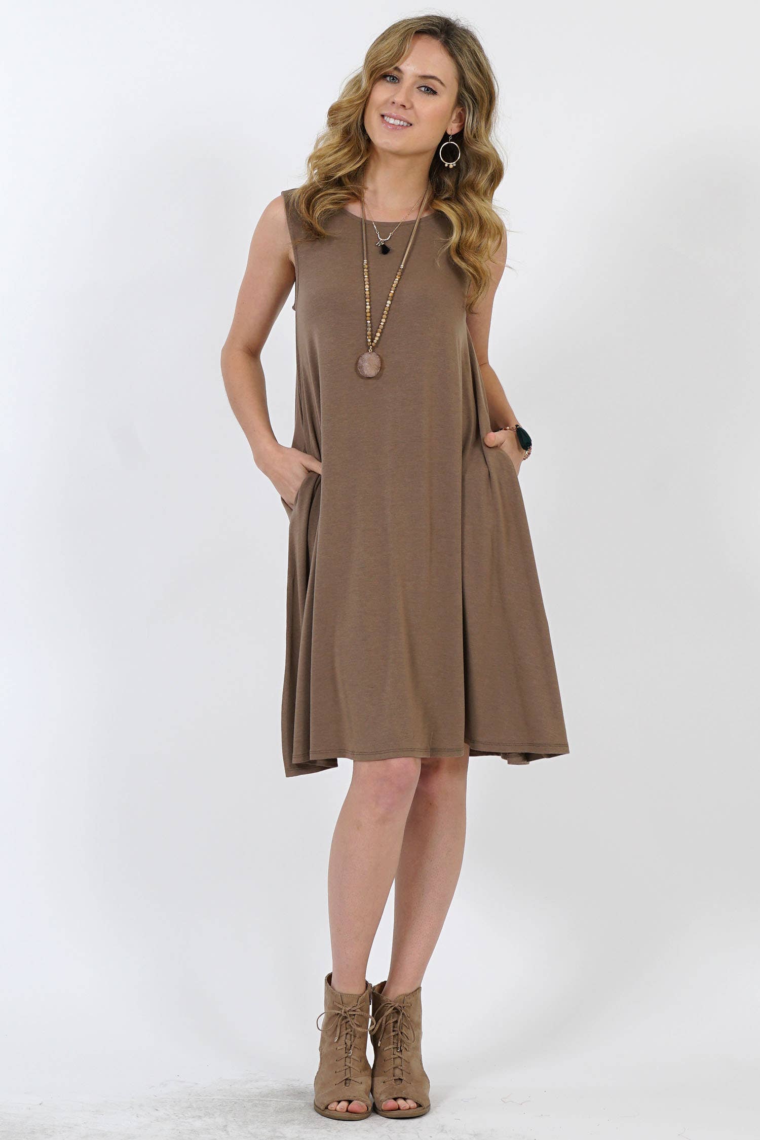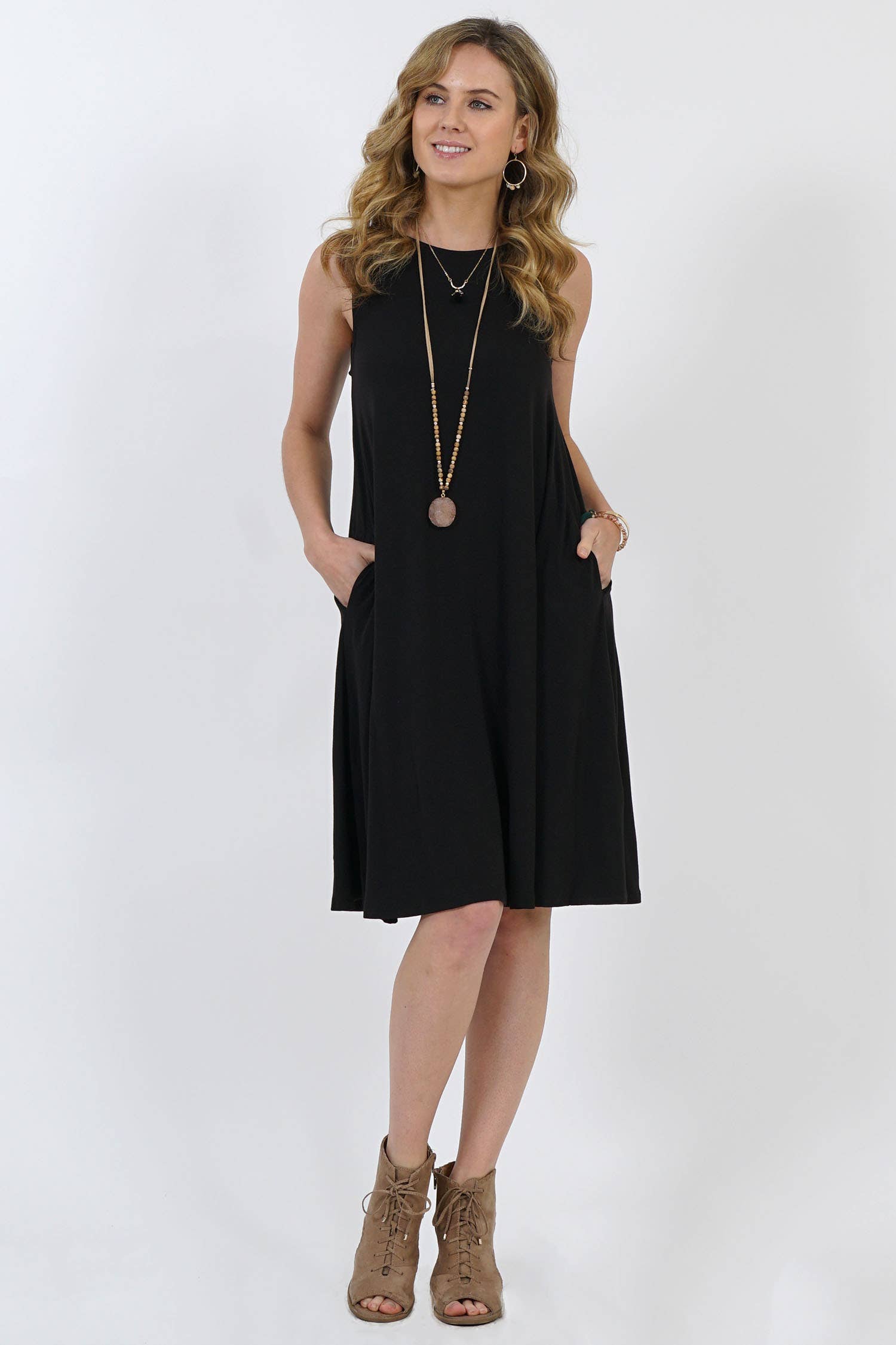 Side Pockets Dress SLEEVELESS FLARED DRESS WITH SIDE POCKETS TOTAL BODY LENGTH: 36", BUST: 34" approx. - MEASURED FROM SMALL Material: 57% POLYESTER 38% RAYON 5% SPANDEX AnchorBestseller